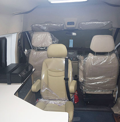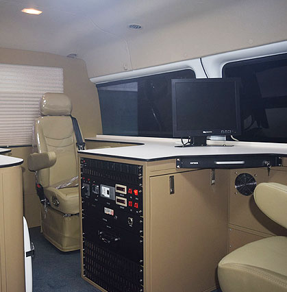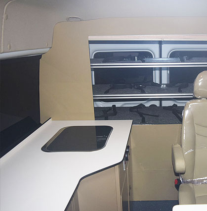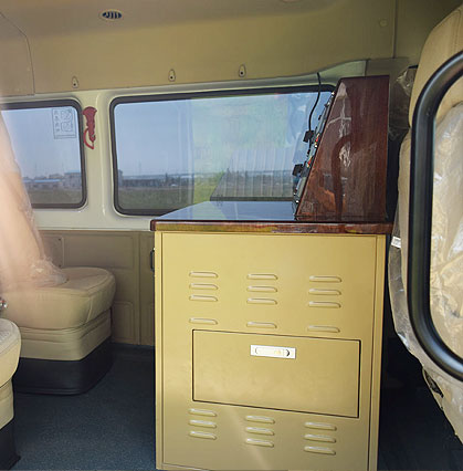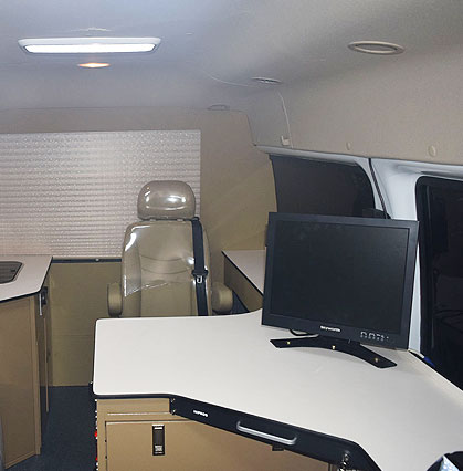 車內配備了工作臺,從車內直接存取勘察設備,直接于車內檢測相應的物證,同時車內配備有洗手系統(tǒng)。