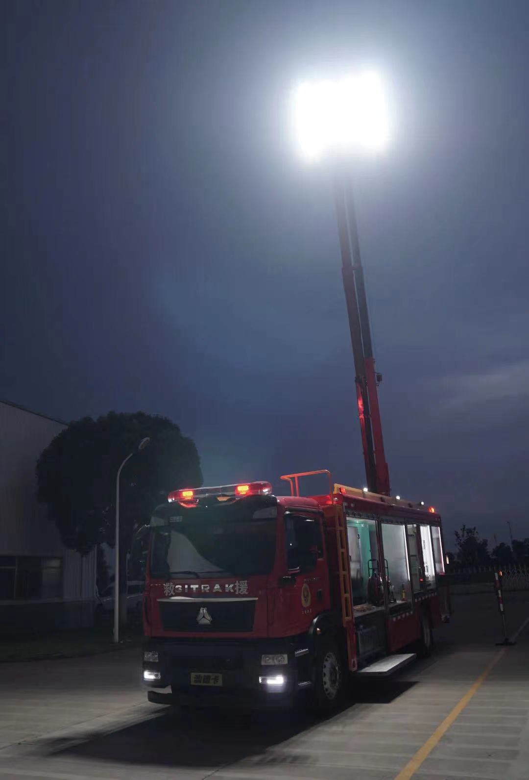 照明車(chē),舉升臂高14米,俯仰角度可達(dá)75度,還可以水平旋轉(zhuǎn)角度±180度,實(shí)現(xiàn)不同角度照明,滿(mǎn)足1000平方的夜間照明度需求。同時(shí)也兼作現(xiàn)場(chǎng)應(yīng)急電源,為通訊、廣播宣傳和破拆器具提供電源保障。夜間救援現(xiàn)場(chǎng)的照明燈。